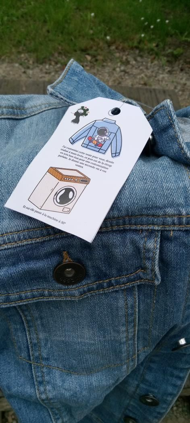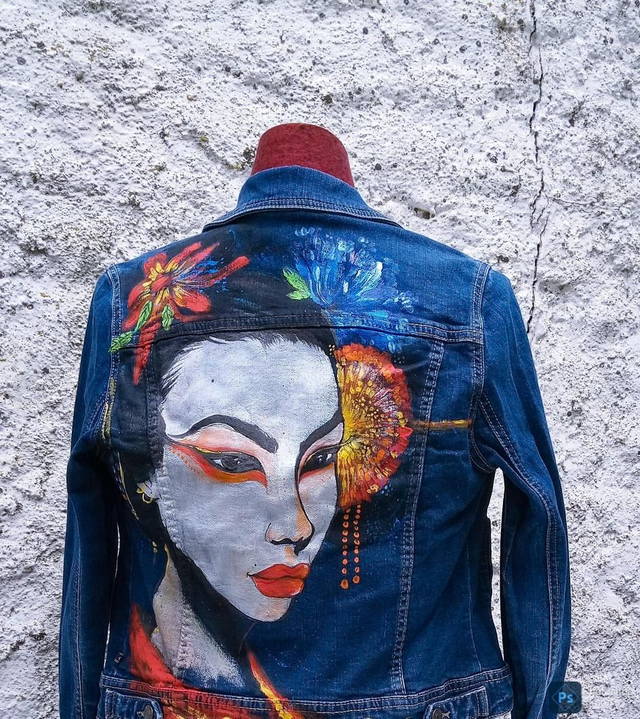 Veste en Jean seconde main customisé par mes soins avec le dessin de Geisha