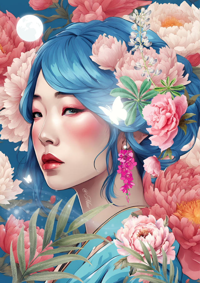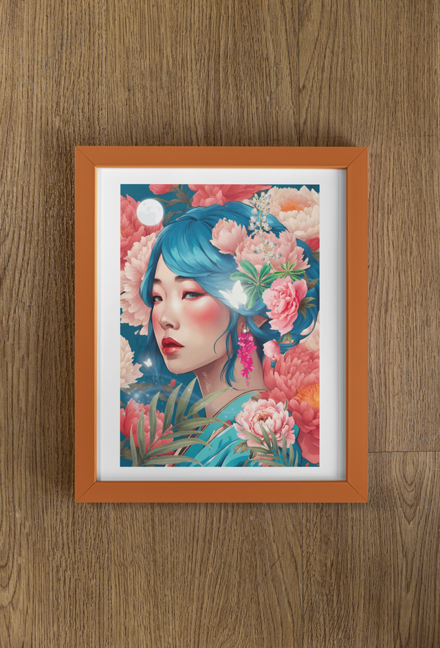 Illustration de femme japonaise à la tablette numérique, imprimé en A4 à encadrer.